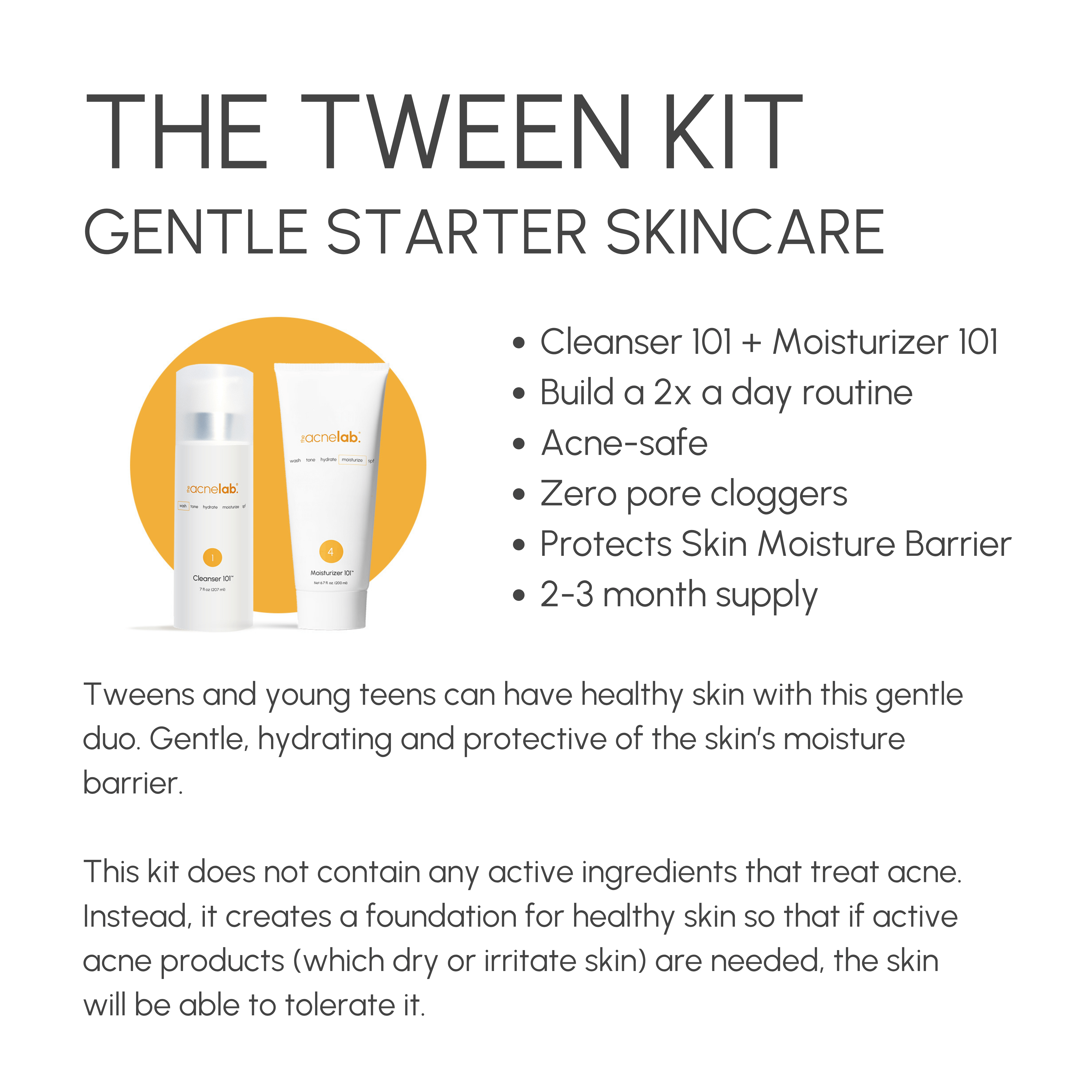 The Tween Kit is a simple, effective routine that's completely safe and gentle for young tweens and tweens. It's free of pore cloggers and will hydrate skin and protect the skin moisture barrier.